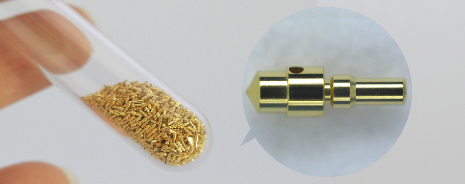 材質:リン青銅, 表面処理:Niメッキ→金メッキ, 用途:電子部品, 大きさ:φ0.3mm×4mm, 穴径:φ0.22mm, 備考:絞り加工