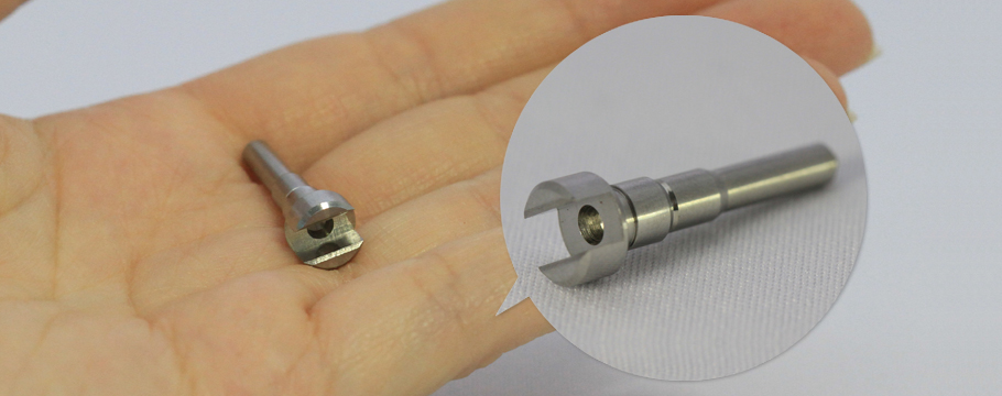 材質:BeCu, 表面処理:Niメッキ→金メッキ, 用途:電子部品, 大きさ:φ0.5mm×2mm, クロス穴径:φ0.15mm, 縦穴:φ0.25mm×1.8mm