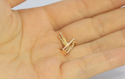 Material: BeCu, Surface treatment: Ni plating → Gold plating, Application: Electronic components, Size: φ0.5 mm × 2 mm, Cross hole diameter: φ0.15 mm, Vertical hole: φ0.25 mm × 1.8 mm