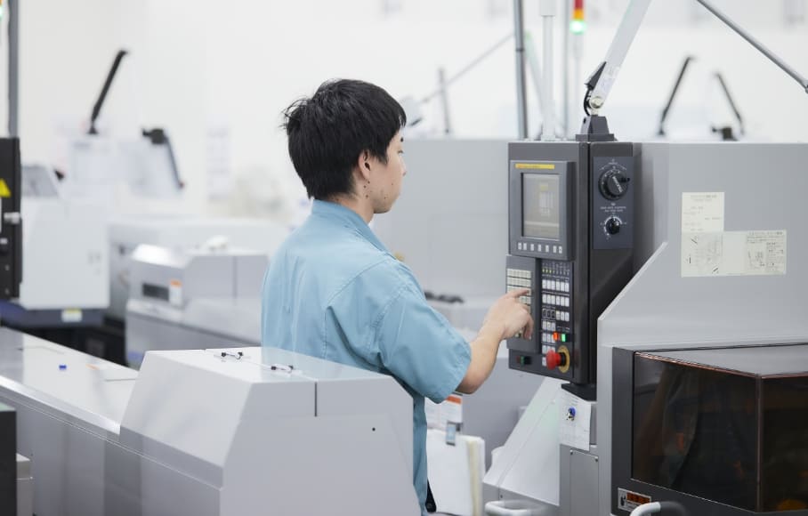 NC旋盤という工作機械を使用し、精密部品を製造しています。現場では100台以上の機械が稼働し、1人で10~20台を担当。顕微鏡を使って製品に異常がないかチェックし、必要に応じて機械を調整。新しい図面に合わせたプログラムの作成や、材料が変更される場合は機械のセッティングから行います。もともと工業関連の学校に通っていたわけではなく、入社当初は正直、「私には無理かも…」と思ったことも。でも現場の先輩方が順を追って優しく教えてくださり、仕事を覚えた今は、毎日が楽しくて時間が過ぎるのが早いです。